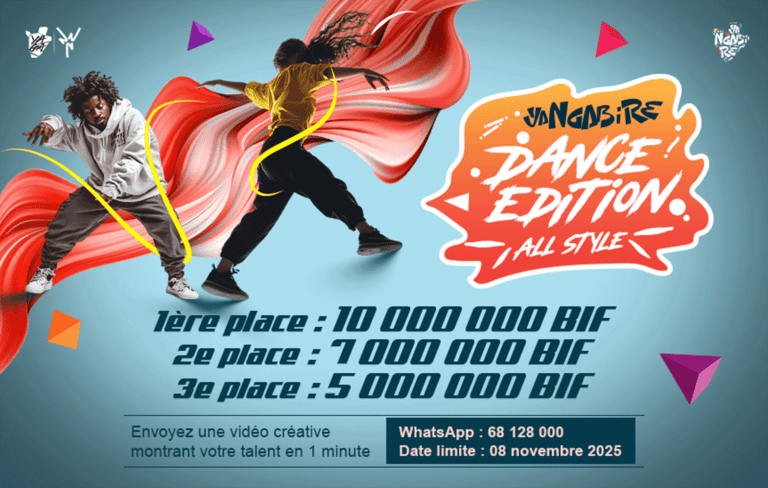 L’appel à candidatures pour Ya Ngabire, Dance Edition – All Style est lancé. Yaga, à travers #Nunganira, revient avec une nouvelle édition de Ya Ngabire, le concours de talents devenu un véritable tremplin pour la jeunesse burundaise. Cette année, place à la danse sous toutes ses formes. Les inscriptions sont ouvertes jusqu’au 08 novembre 2025.
